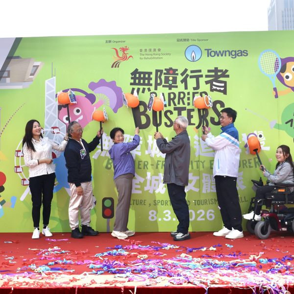 Dr. Joseph Kwok, BBS, JP, President of HKSR; Dr. Steve Cheng, Member of the Executive Committee and the Chairperson of the Fundraising and Social Enterprise Committee of HKSR; Ms Linda Lam, SBS, Chairperson of the Equal Opportunities Commission; Mr. Sammy Kong, General Manager – Commercial & Industrial Marketing & Sales of The Hong Kong and China Gas Company Limited (Towngas); Ms Carrie Chung, Deputy CEO of HKSR; Ms Ho Yuen Kei, BBS, HKSR Ambassador